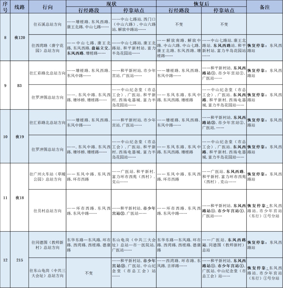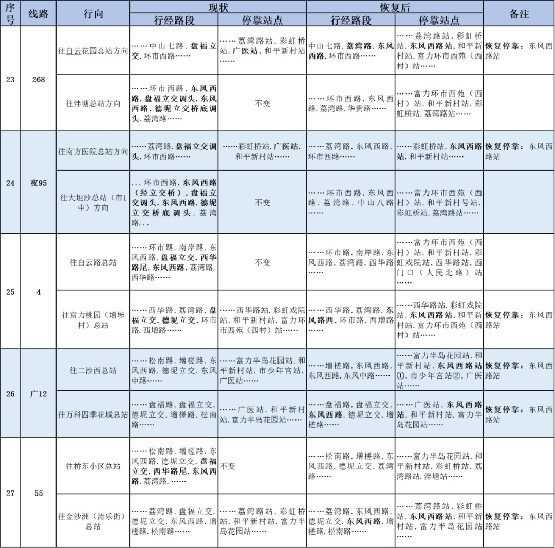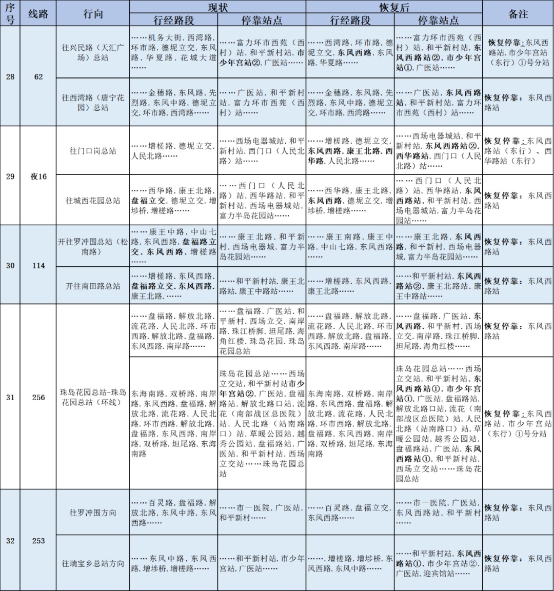调整公共汽车B3、广12、62、80路等32条线路取消绕行盘福立交、南岸路、流花路、西华路等路段,恢复行经东风西路、荔湾路等路段接回原线路行驶,并恢复停靠公共汽车东风西路站(西行)。
