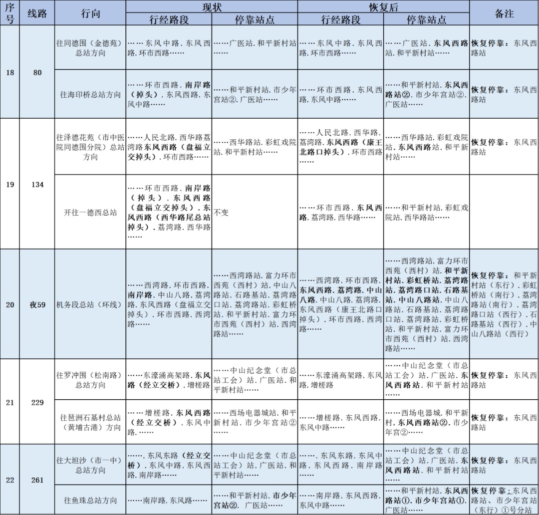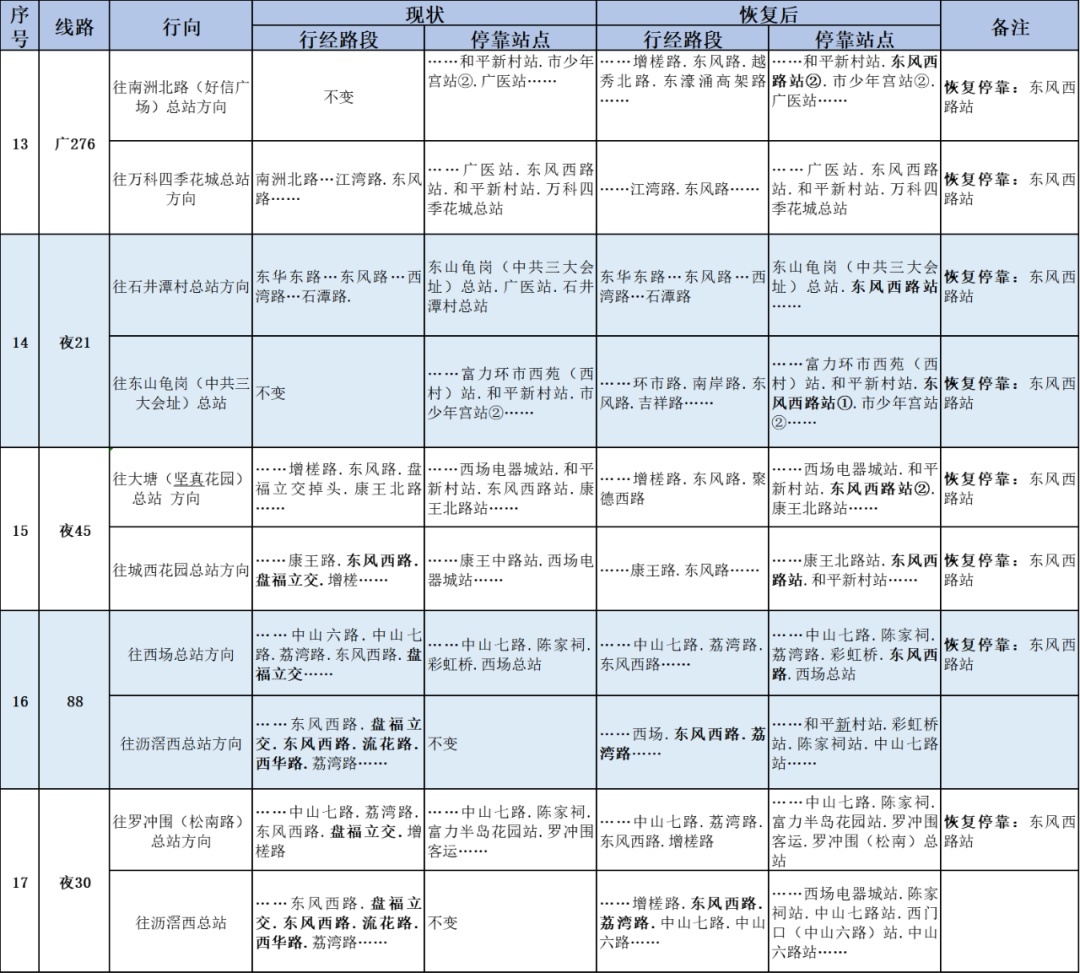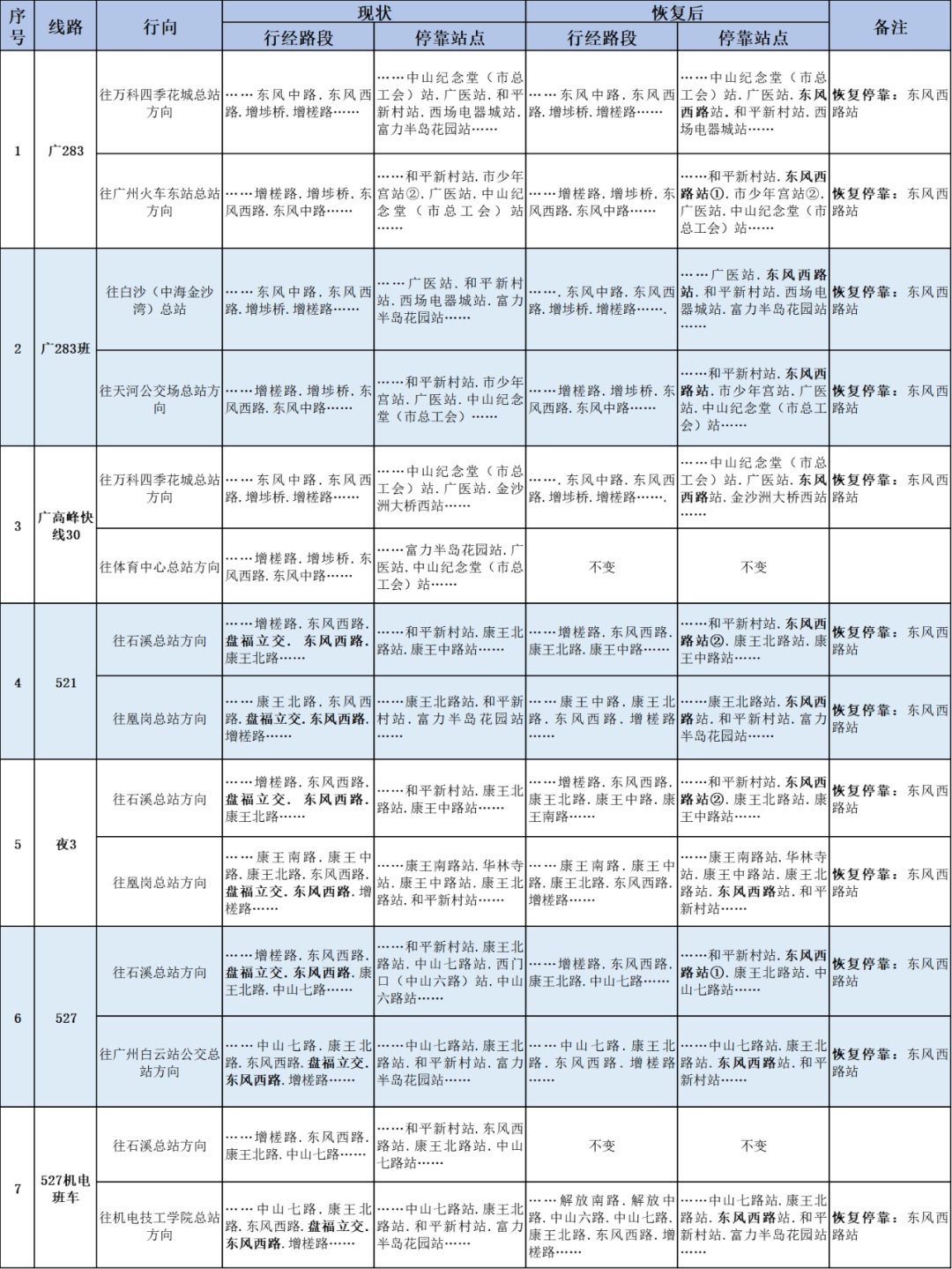 调整公共汽车B3、广12、62、80路等32条线路取消绕行盘福立交、南岸路、流花路、西华路等路段,恢复行经东风西路、荔湾路等路段接回原线路行驶,并恢复停靠公共汽车东风西路站(西行)。