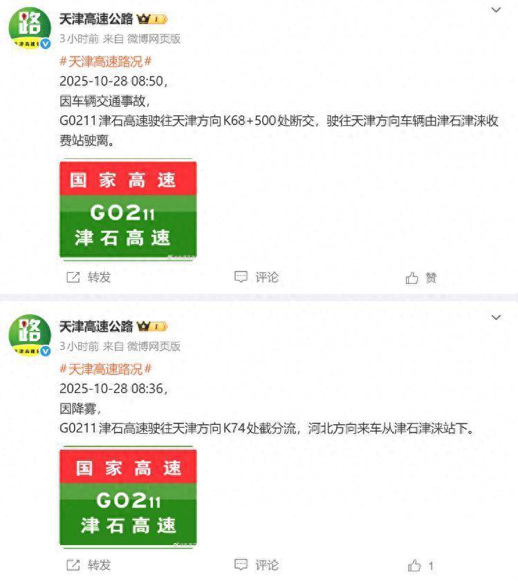 据天津高速公路官方微博消息,受降雾影响,G0211津石高速驶往天津方向于上午8时36分左右在K74处实施截流。8时50分,因车辆交通事故,G0211津石高速驶往天津方向K68+500处断交,驶往天津方向车辆由津石津涞站驶离。截止中午12时,K68+500仍未恢复通行。