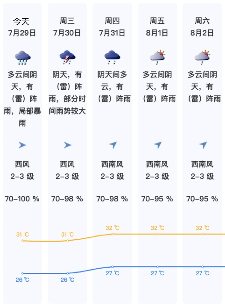 7月29日,多云间阴天,有雷阵雨,局部暴雨,雨时伴8级左右短时大风,气温26℃~31℃;